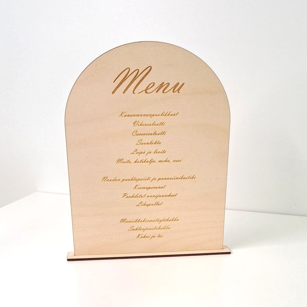 Puinen menu -kyltti valmistetaan 3 mm kotimaisesta koivuvanerista. Kylttiin kaiverretaan häiden menu. Kyltin koko on 19 x 25 cm. Saatavilla myös eri kokoisena ja eri fontilla, kysy lisää info@designbyilo.fi.