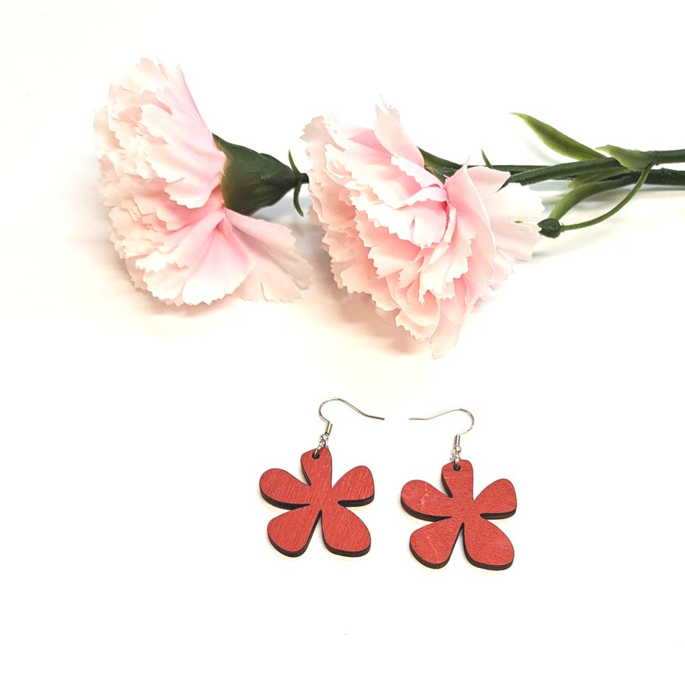 Puiset kukka korvakorut on valmistettu kotimaisesta 3 mm koivuvanerista. Puuosan koko on n. 3 x 3,5 cm.