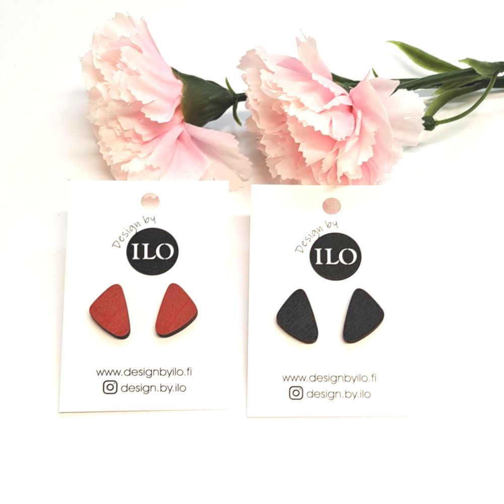 Puiset korvakorut on valmistettu 3 mm kotimaista koivuvanerista. Metalliosat on kirurginterästä. Koivun väriset on käsitelty puunsuoja-aineella suojaamaan lialta, kosteudelta ja auringon uv-valolta. Muut värit on käsitelty ympäristöystävällisellä maalilla tai puuvahalla. Puuosan koko n. 1,5 x 2 cm.